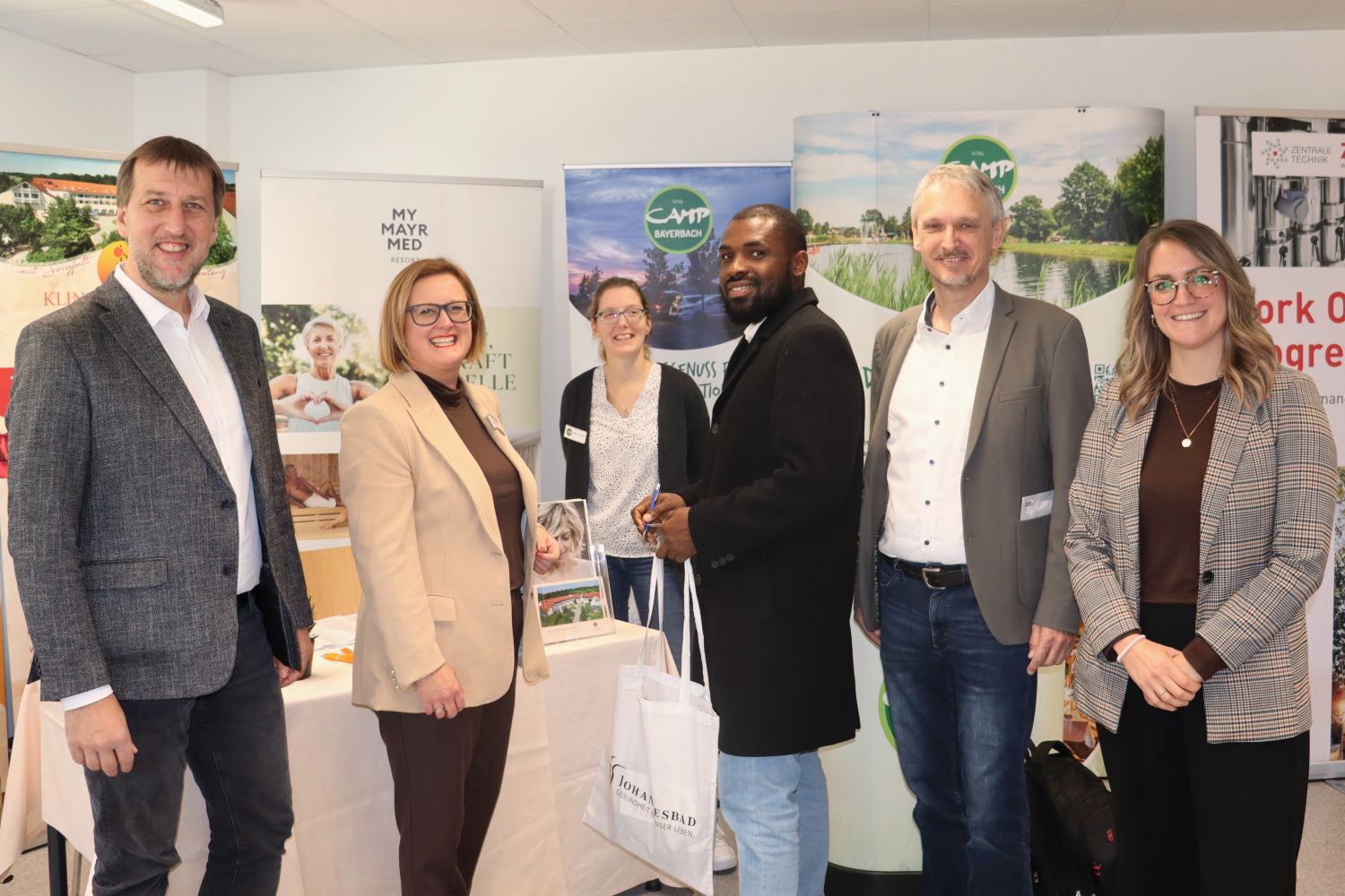 Bild (THD/ECRI): Beim Rundgang über die Jobmesse am European Campus Rottal-Inn (ECRI) der Technischen Hochschule Deggendorf (THD): Bürgermeister Wolfgang Beißmann (von links), Bianka Hallhuber (Rosenhof), Katja Schmidt (Vital Camp), Health-Informatics-Student Uche Nwachukwu aus Nigeria sowie Dekan Prof. Dr. Steckenbauer und Claudia Probst (THD-Servicezentrum Studium).