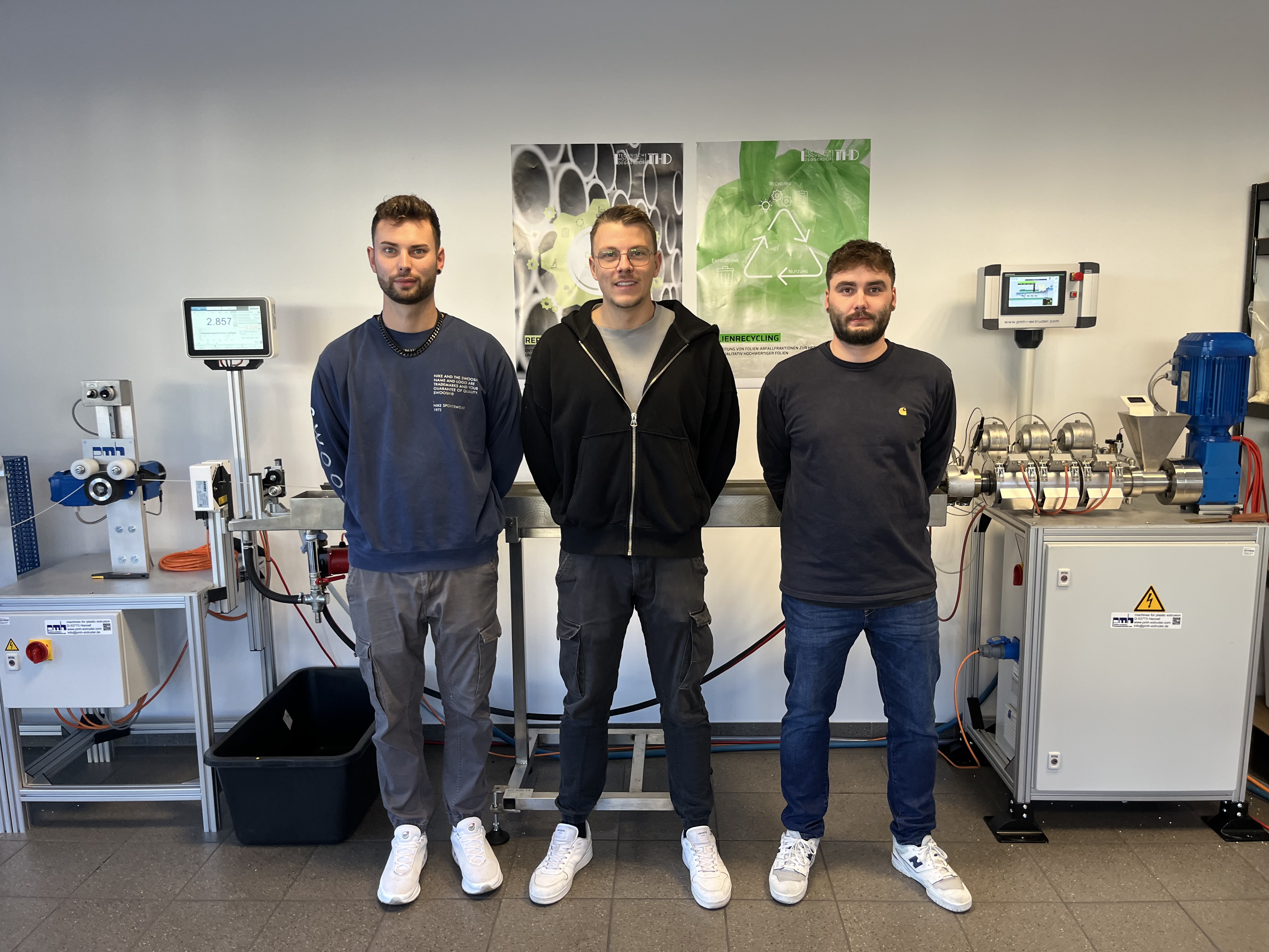 Drei angehende Techniker erforschen direkt am Campus, wie sich mehrfach recycelte Kunststoffe verändern.