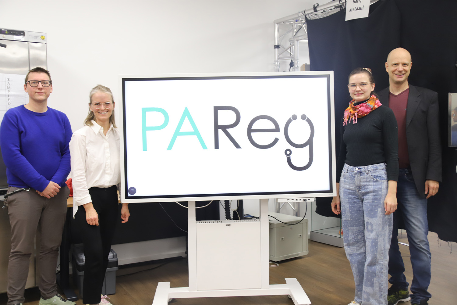 Bild (THD): Prof. Dr. Kathrin Burgmaier (2.v.l.) und Prof. Dr. Dr. Mathias Burgmaier (r.) sowie die beiden wissenschaftlichen Mitarbeitenden der Studie, Antonia Hofmann und Stefan Schönstein, freuen sich, dass die Studie „PA-Reg“ nach umfassender Vorbereitung nun gestartet ist.