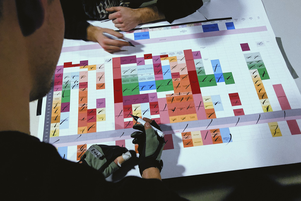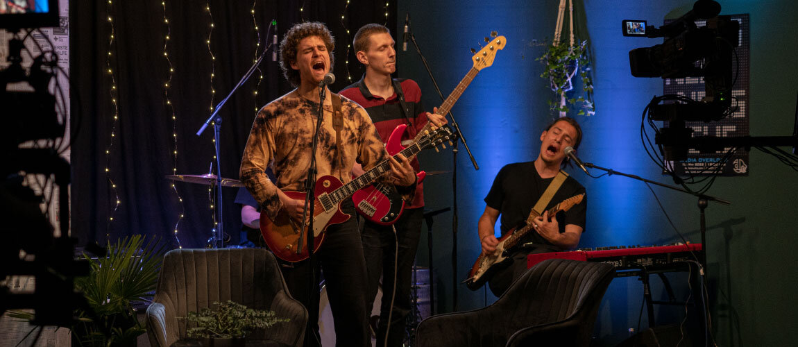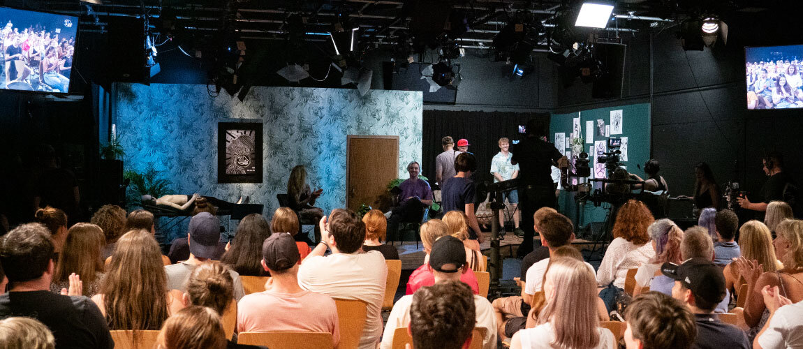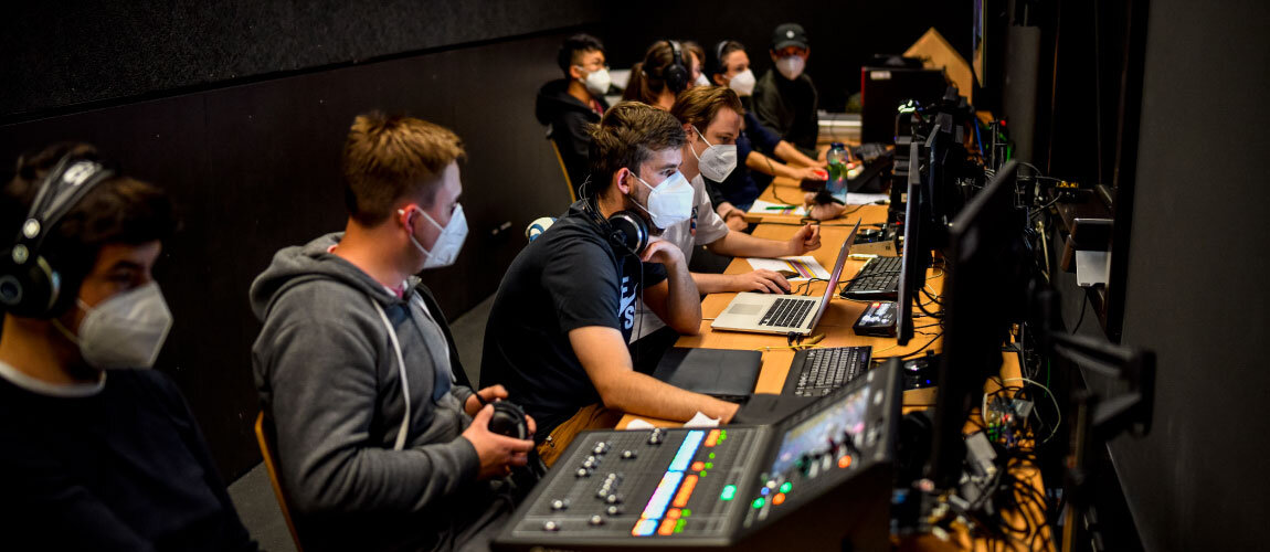 Die Umsetzung ist ein dynamischer und interaktiver Prozess. Die Studierenden treffen sich mindestens einmal pro Woche in einer Redaktionssitzung, um Ideen, Fortschritte, Probleme und ihre Lösungen zu diskutieren. Das Technikteam probt regelmäßig den Umgang mit der komplexen Studiotechnik, um diese bis zur Sendung sicher zu beherrschen. Sobald der Sendeplan steht, studiert das Technikteam die geplanten Abläufe ein, bis die einzelnen Gewerke wie ein Uhrwerk zusammenarbeiten. Der Reiz einer Live-Sendung liegt darin, dass trotz aller Vorbereitungen immer etwas Unvorhergesehenes passieren kann, auf das man spontan reagieren muss. Am Tag der Sendung ist es schließlich so weit. Die Generalprobe war fast perfekt, die Gäste sitzen in der Maske, die Moderator*innen haben Lampenfieber, das Publikum im vollbesetzten Medienatelier wartet gut gelaunt und erwartungsvoll auf den Moment, in dem um Punkt 18:00 Uhr das Licht erlischt und die Show beginnt.
